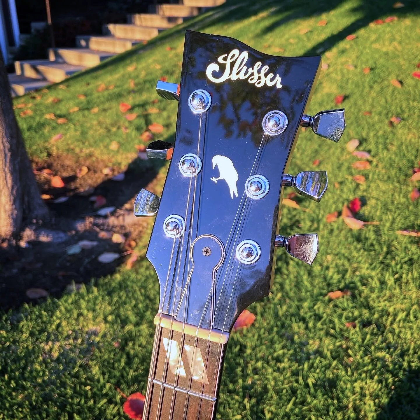 Since making the original Slusser A-Frame for Henri Cash, a custom 24” scale version was made for his Cash & Skye partner, Sophia Skye. Her smaller A-Frame has thinner bracing and a piezo LR Baggs T Bridge pickup so she can easily toggle between acoustic and electric tones on stage without changing guitars. Additional 24.75” scale examples of the A-Frame are out there with more conventional binding and various custom vibratos. If you want something special that you’ll never see anywhere else, this guitar is it!