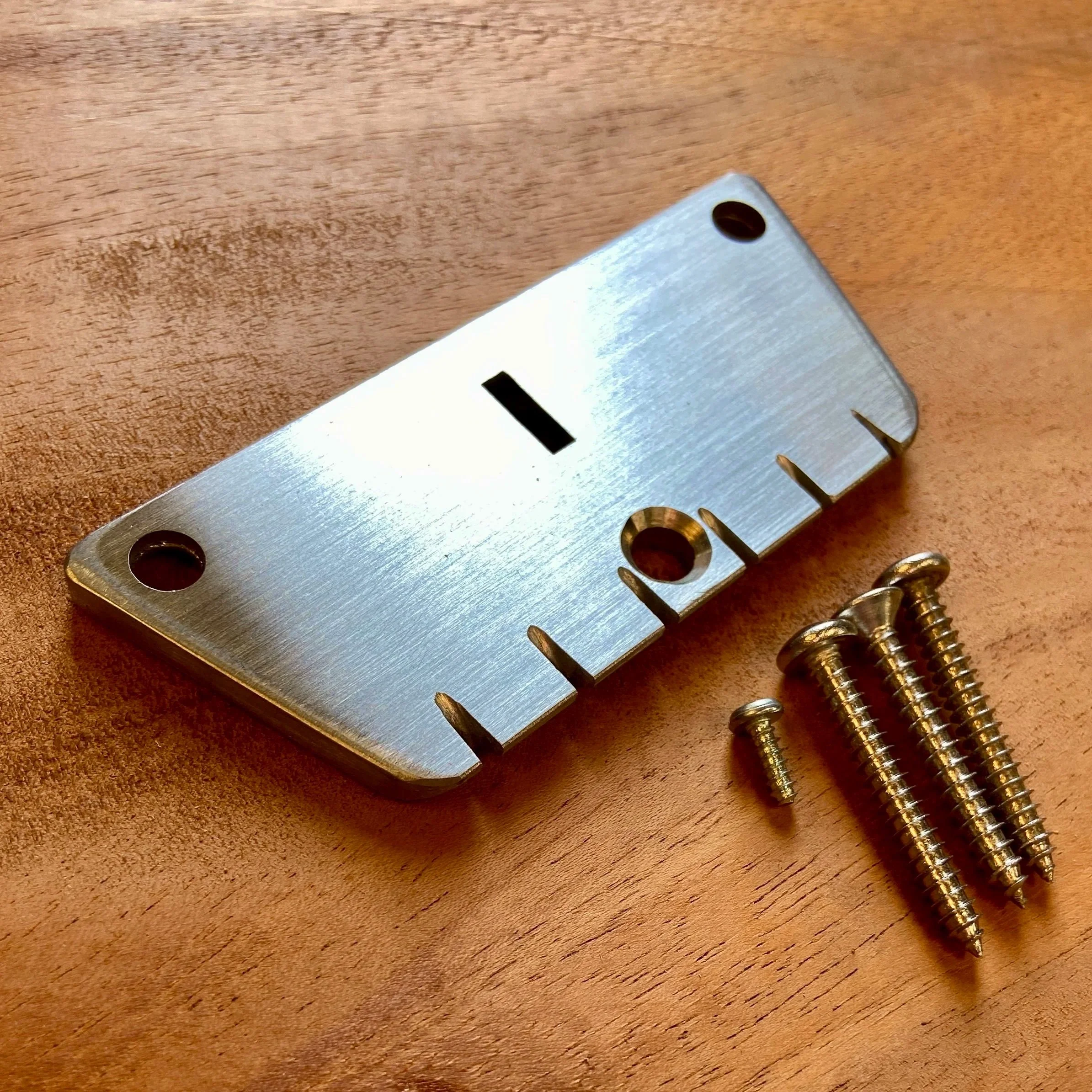 Another key improvement offered with this upgrade bridge is a new style of interface between the two forward screws and the bridge plate. The Slusser Guitars Dano Bridge features button head screws with matching ball-style sockets on the underside of the bridge plate. This offers a consistent interface that is less dependent on having the bridge perfectly flat longitudinally (the axis the strings follow). This design better transfers string vibration to the body for improved sustain and amplification of the unique and sought after tone that Danelectro masonite hollow and semi-hollow bodies offer.