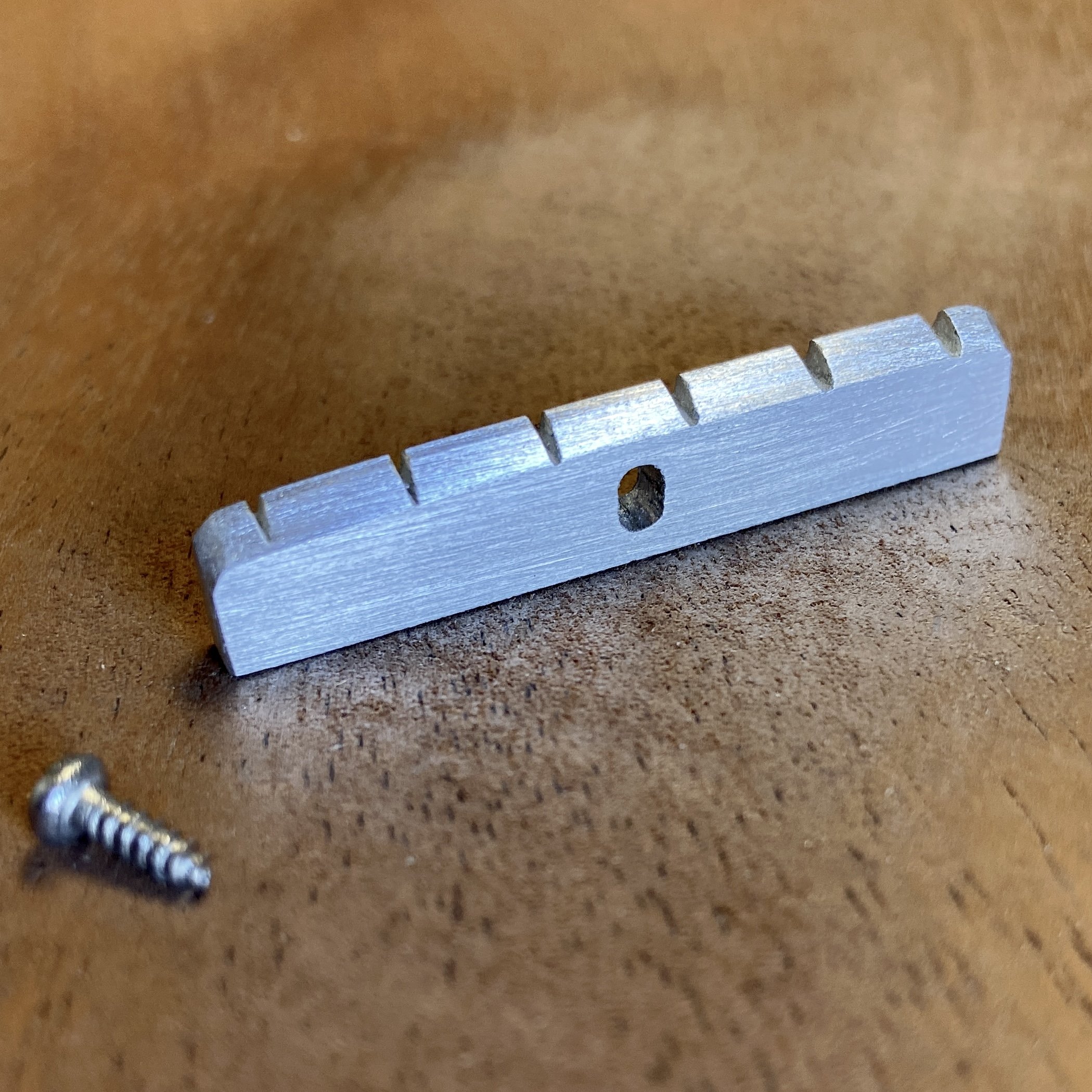 Many vintage and vintage spec reissue Danelectro guitars came with zinc alloy nuts; commonly referred to as “aluminum” by many collectors. Slusser Guitars Dano Metal Nuts are OEM factory-correct sized replacements made from your choice of 7075 aerospace-grade aluminum or brass.